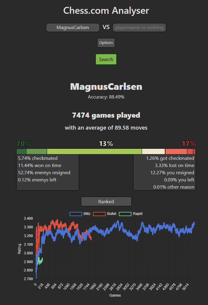 By searching for your chess.com profile name, you get a comprehensive and detailed analysis of your performance metrics. This includes an immediate overview of your precise win/loss/draw ratio and overall win rate. For a deeper understanding of your progress and strategic development, the available interactive graphs offer invaluable insights into how your performance has evolved over time, allowing for a thorough and useful overview of your games.