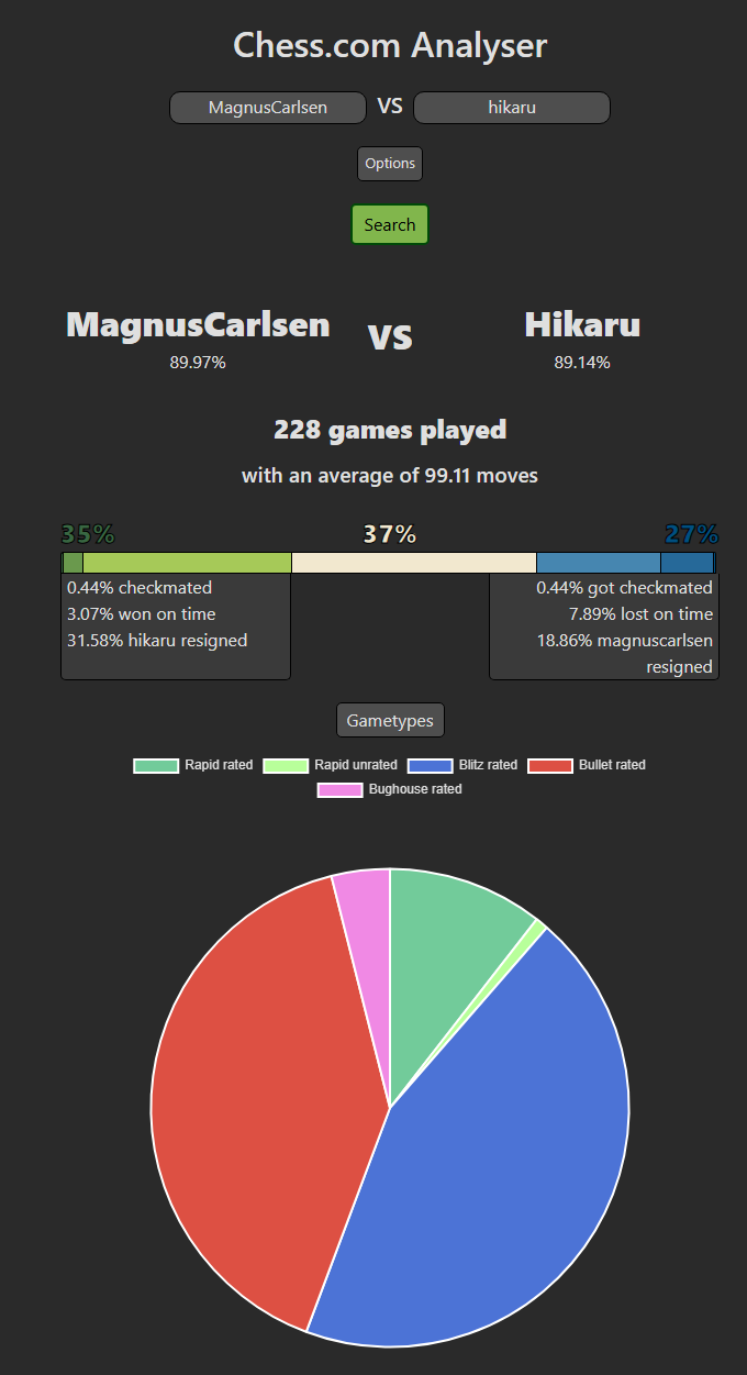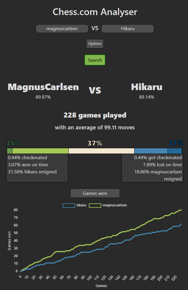 The website is using the Chess.com API. The website offers a comprehensive analysis of all games played by a user, displayed through an intuitive and user-friendly interface. It organizes a wide range of data-including win/loss statistics, accuracy trends, and rating progression, making it easy to explore and compare performance across different aspects of gameplay. One of the platform’s most useful features is its direct integration with Chess.com: each game includes a link that takes you straight to the corresponding match on Chess.com for detailed review.
