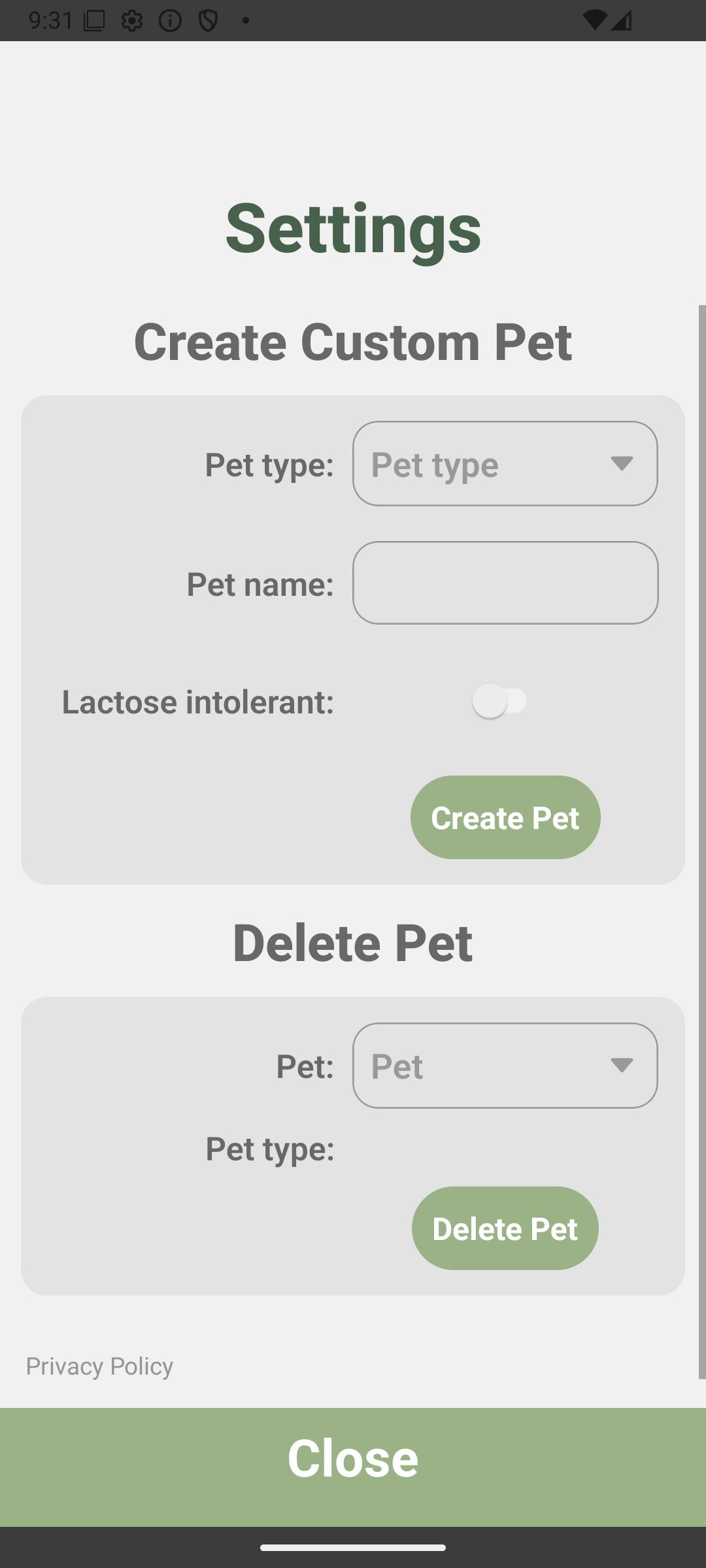 In the settings, you have the opportunity to design your very own personalized pet. You can give it a unique name, and specify any intolerances to ensure optimal results. Should you change your mind or no longer need a pet, you can also easily delete it here at any time.
