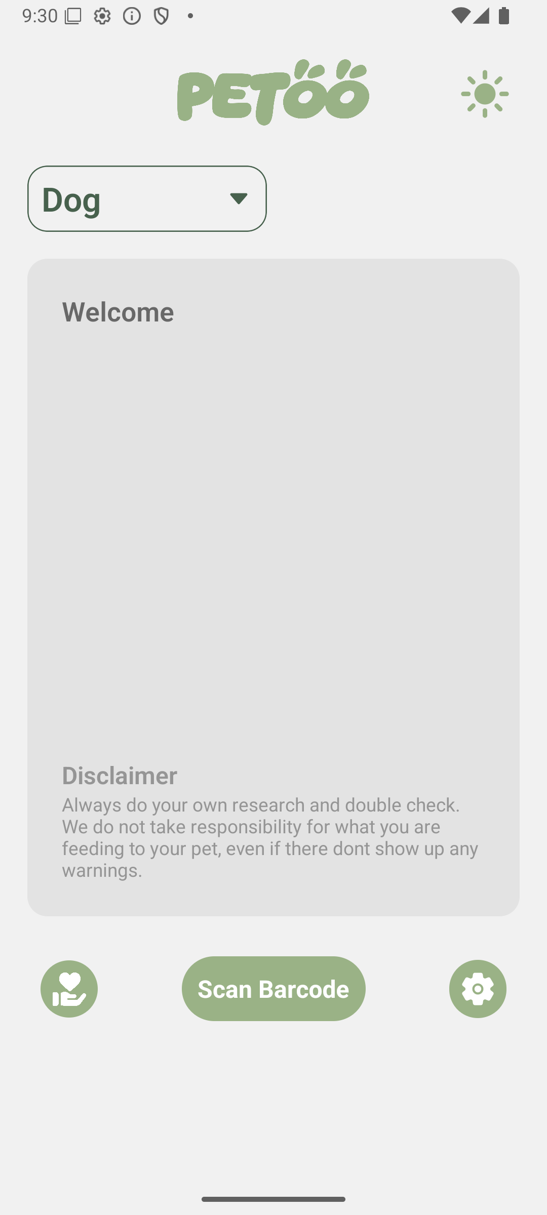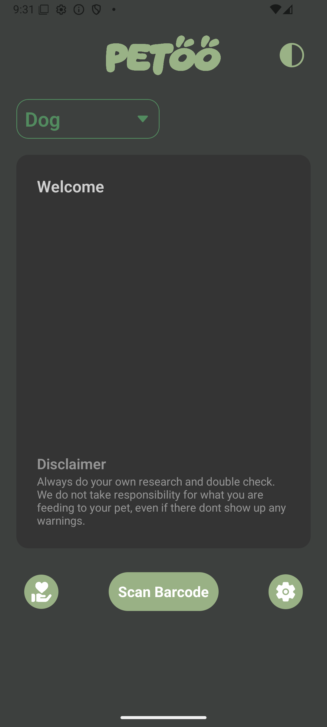 Upon entering the welcome screen, you are presented with intuitive options to begin. Here, you can easily select the specific type of your beloved pet before proceeding to either click the prominent "Scan Barcode" button to utilize your device's camera for a quick scan of your product, or, for added convenience, you have the alternative to manually input the barcode digits directly.