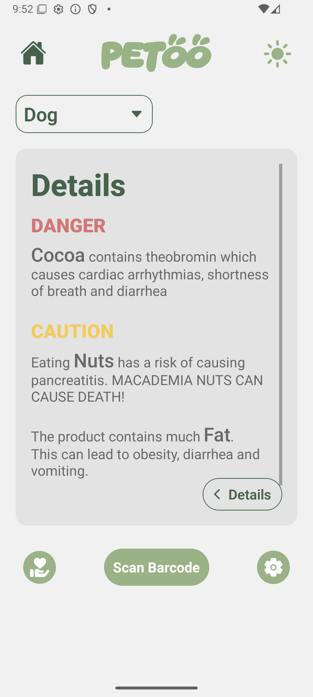 With this feature, you can effortlessly scan a product's barcode to instantly identify ingredients that might be harmful or require caution for your beloved pet. Should a product's barcode not yet be associated with an entry, you're asked to download the Open Food Facts app and adding the product to their comprehensive database, ensuring valuable information for all pet owners.